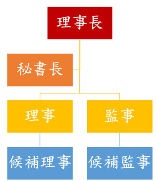本會置理事9人(含常務理事3人,其中1人為理事長)、候補理事3人。常務理事,由全體理事互選之。理事長,由全體理事就常務理事中選舉之。